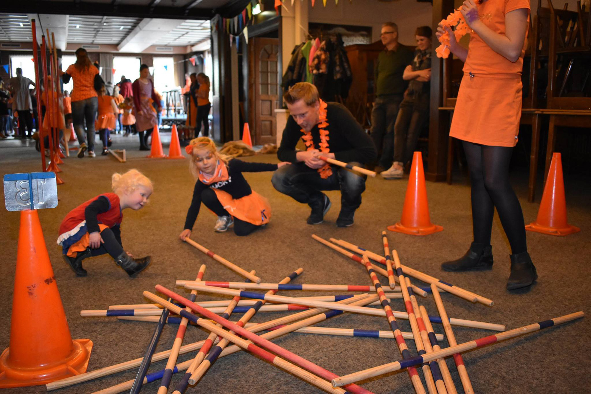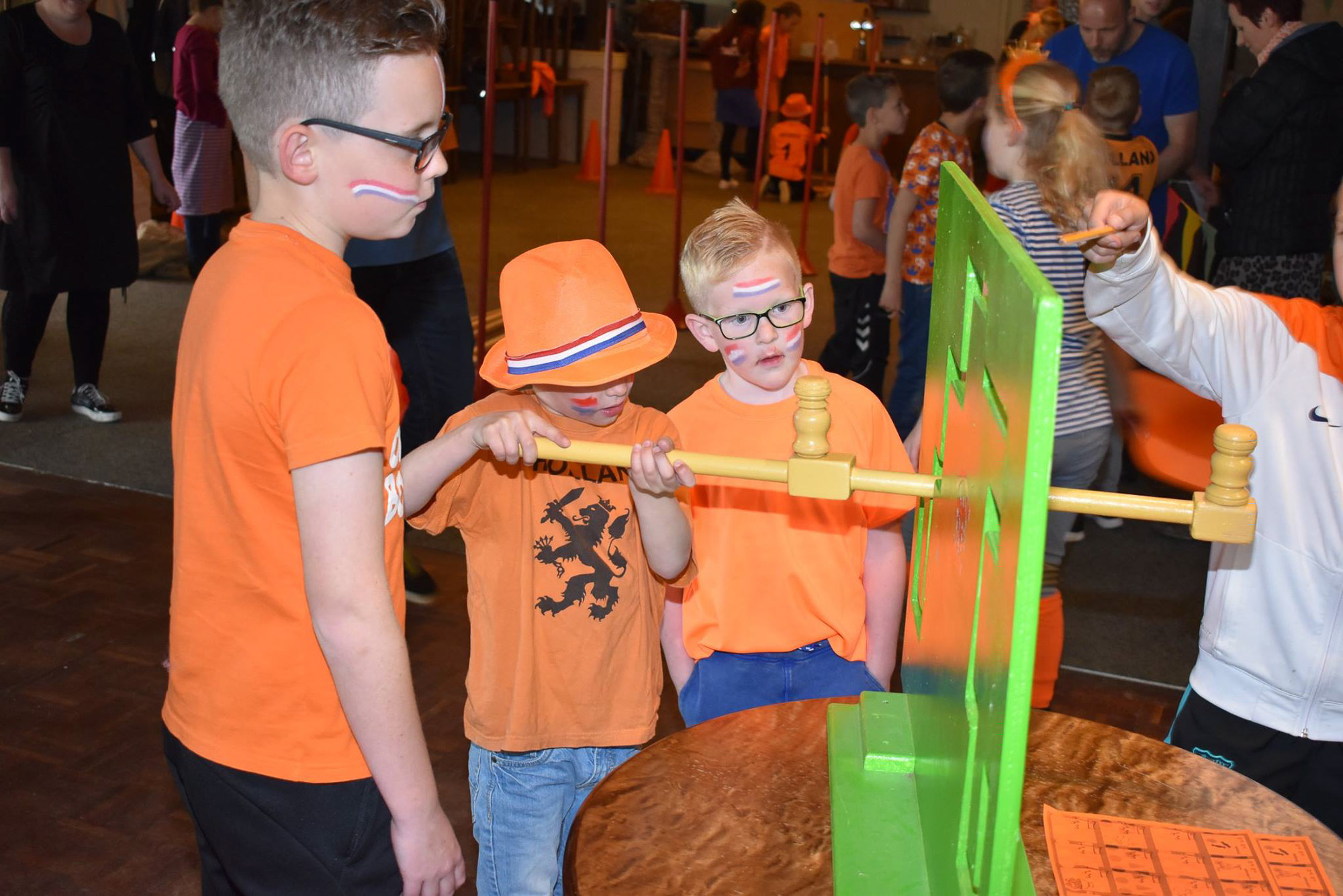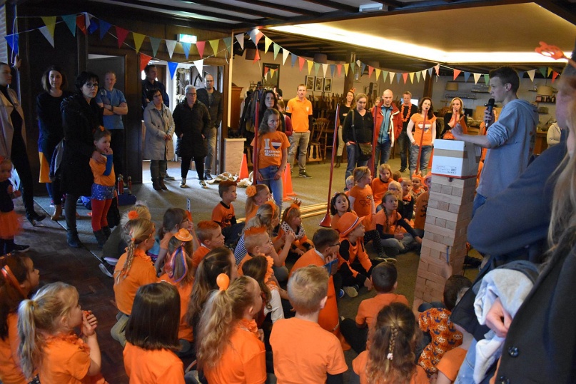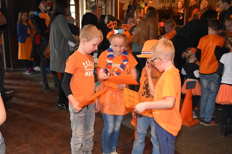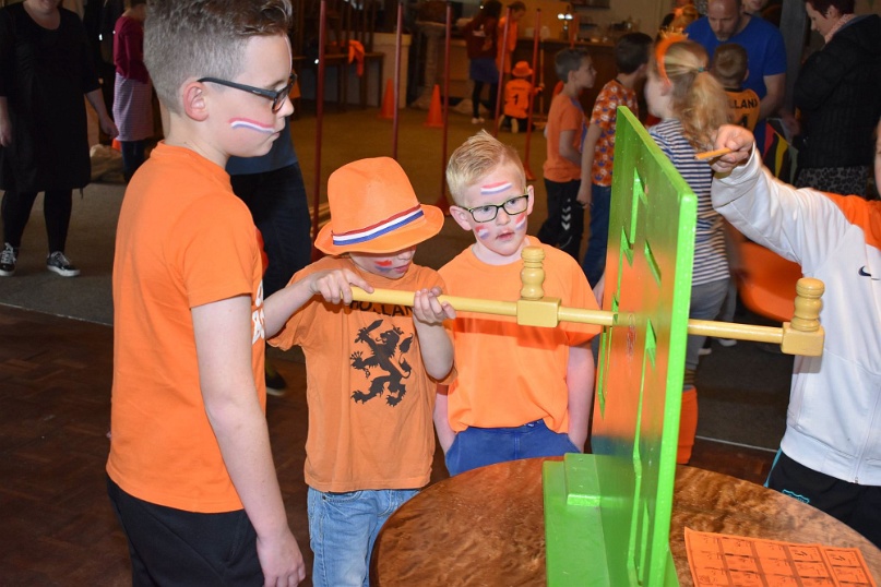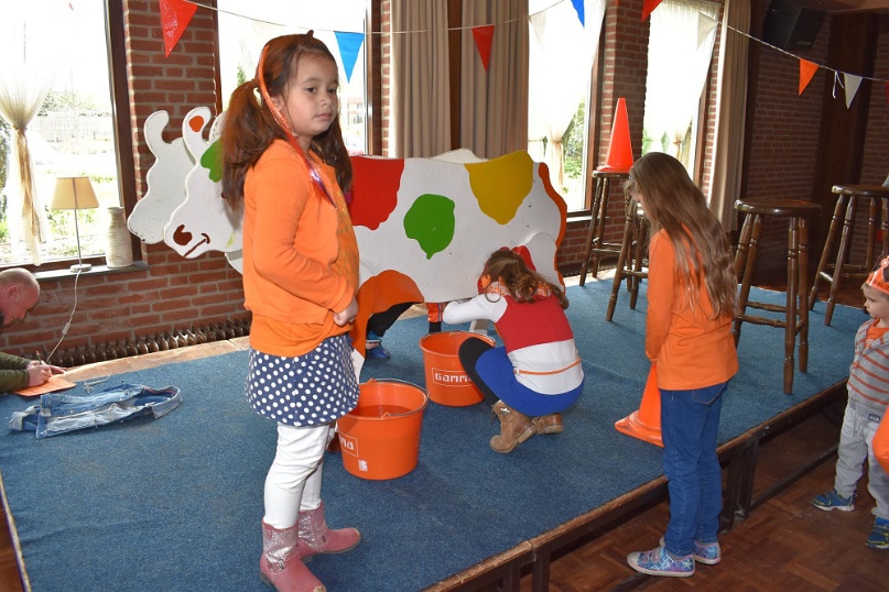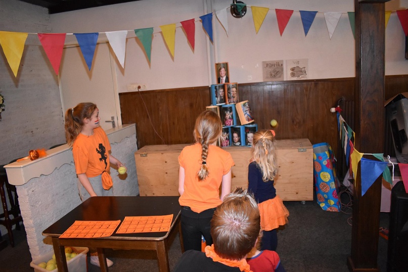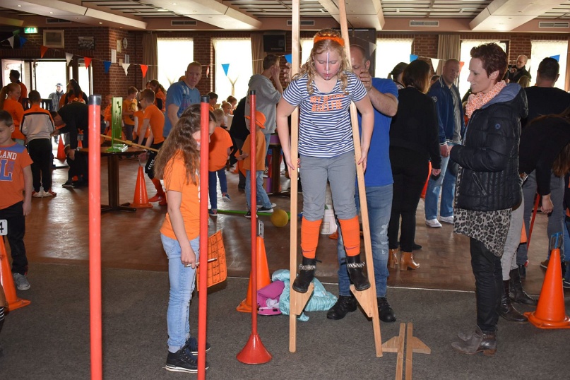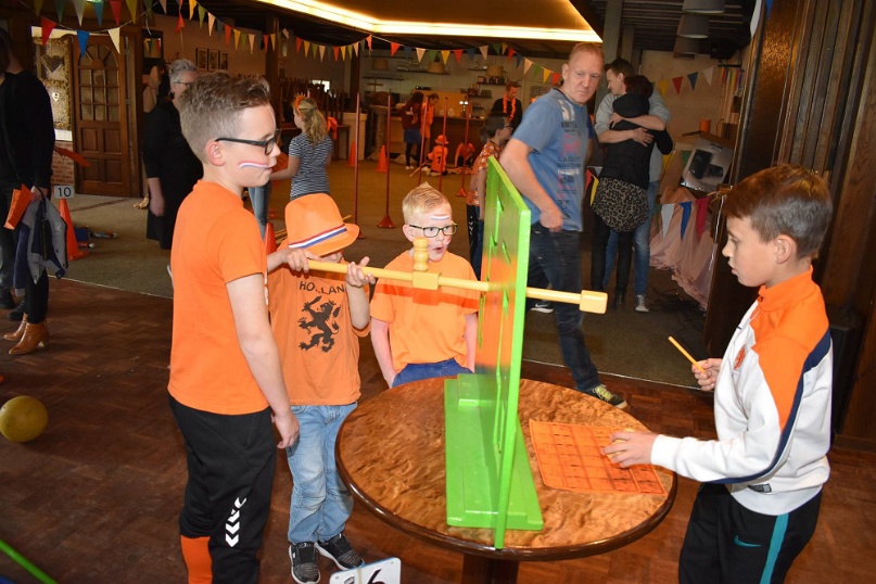 Kegelen, zaklopen, blikgooien, koemelken. De kinderen tot en met groep 5 konden zich tijdens Koningsdag helemaal uitleven op de oud-Hollandse spellen in de grote zaal van De Pruuver. In eerste instantie waren deze spellen gepland in het Heijmanspark. Sombere weersvooruitzichten heeft organisator Oranje Comité/Kindervakantiewerk Afferden doen besluiten deze activiteiten over te hevelen naar De Pruuver. Foto's: Frans Thonen