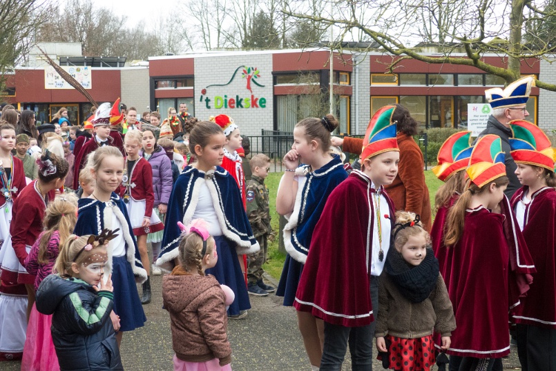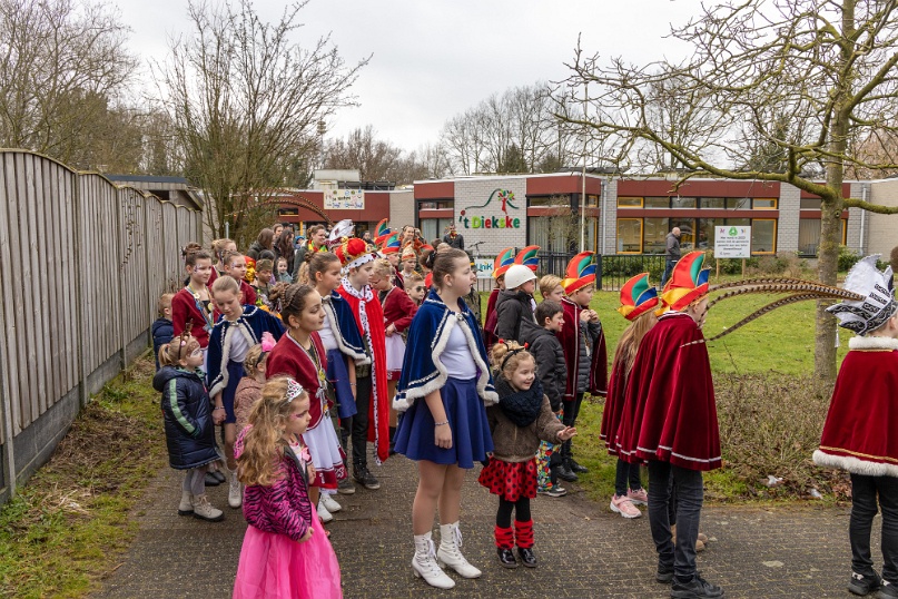 Voorafgaand aan de schoolpronkzitting in zaal de Pruuver wordt in optocht schoolprinses Julie opgehaald door schoolprins Lars, de vorst, alle kinderen van 't Diekske. Verder lopen o.a. de jeugdprins- en prinses van de Sneuzels, de prins van de Peijas en het prinsenpaar van de Pikkuls nog mee.